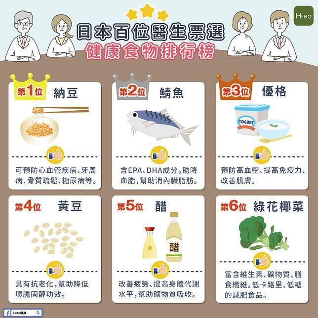 健康意識抬頭,許多人開始注重健康、養身,而飲食就是影響健康的關鍵,因為飲食是人體賴以生存的條件,與人體健康息息相關。麵對玲瑯滿目的食物,如何選、如何吃健康,成為不少人心中的疑惑。日本TBS電視「名醫のTHE太鼓判」邀請了300位醫生,票選出他們心目中對健康最有幫助的食物,以下就帶你了解前6名的食物。