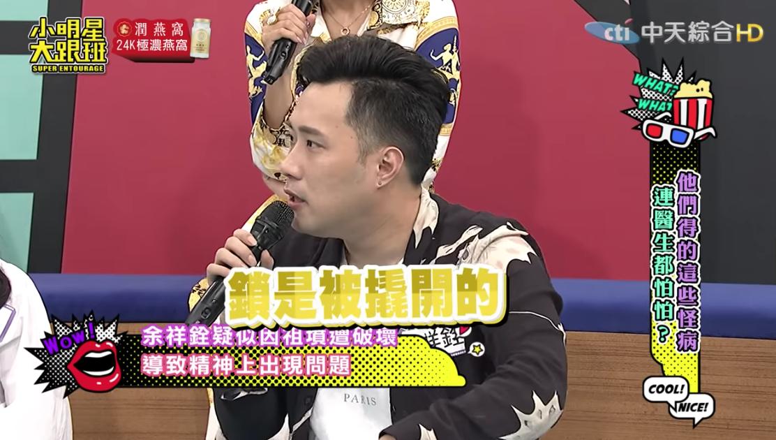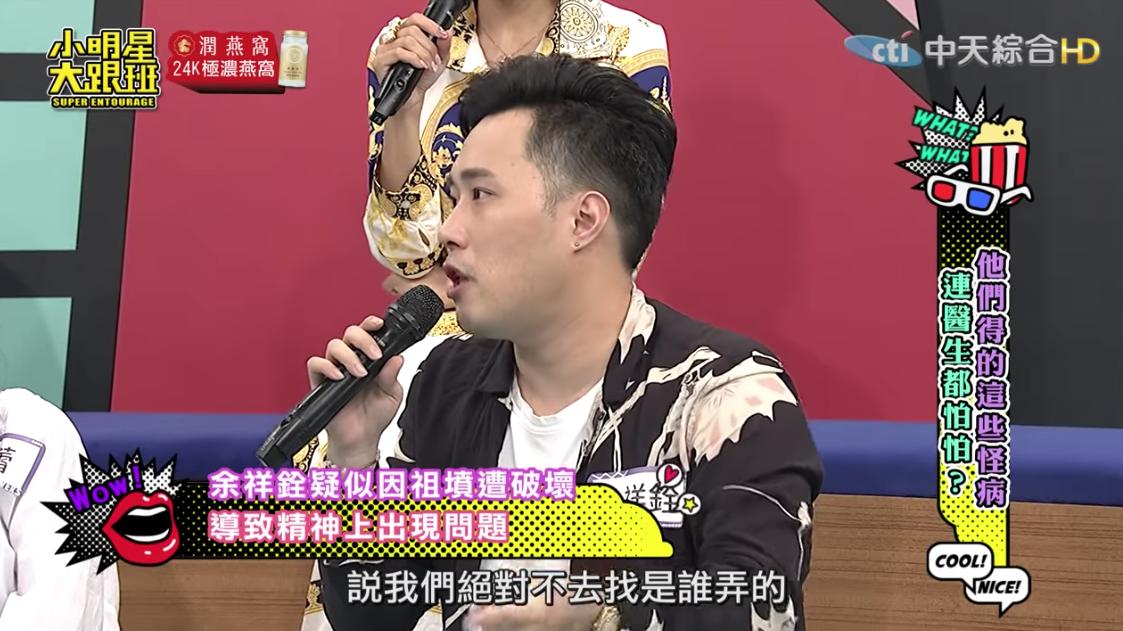 日前餘祥銓在節目《小明星大跟班》中又再次聊起這件事,表示他其實處於一個分不清現實與夢境的狀態,「一直在做惡夢,很像一個黑洞很可怕,每天只清醒2小時。」而當時爸媽為了他,把所有「師字輩」的專家都請到了家裡,包括醫師、法師、牧師等。但他一知道法師要進門時,就會跳起來指著三樓供奉祖先的地方,狂飆三字經,就好像有話要傳達一樣。