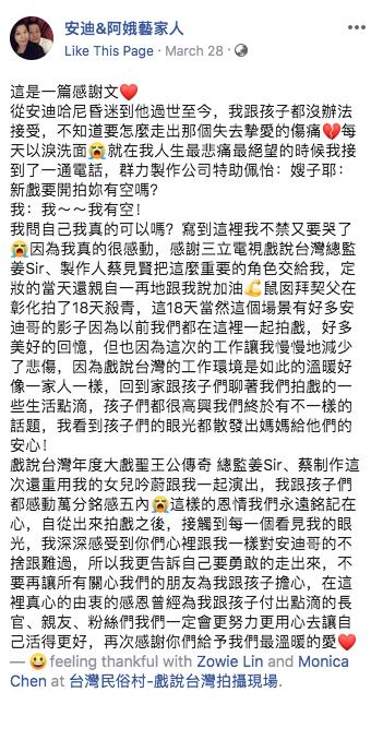 而陳慧娥事後也在臉書上PO文,證實了這則消息。她表示,其實全家人至今都不太能接受安迪的離開,不知道要如何才能走出失去摯愛的傷痛,還好在人生最灰暗的時候,接到了邀她拍戲的電話。雖然只有18天就殺青了,但那段日子幫她找回了許多跟老公有關的回憶,「這個場景有好多安迪哥的影子,因為以前我們都在這裡一起拍戲,這讓我慢慢地減少了悲傷」。