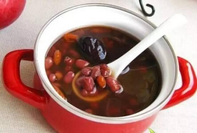 五紅湯組成:紅棗七牧,紅豆50克,紅花生50克,紅糖適量,枸杞5克,五味共同熬湯,連湯共食用。