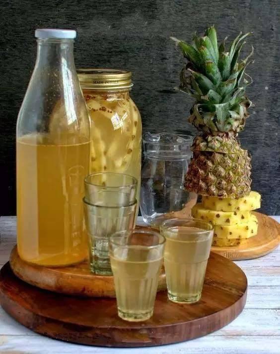 將鳳梨皮切成小塊,將白糖、鳳梨皮和水按照1:3:10的比例混合, 密封保存約2周左右,就能發酵製成鳳梨酵素。