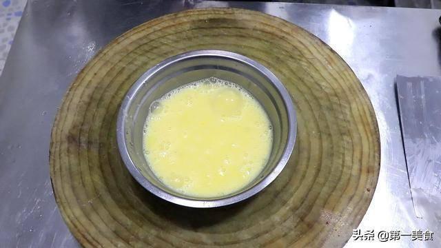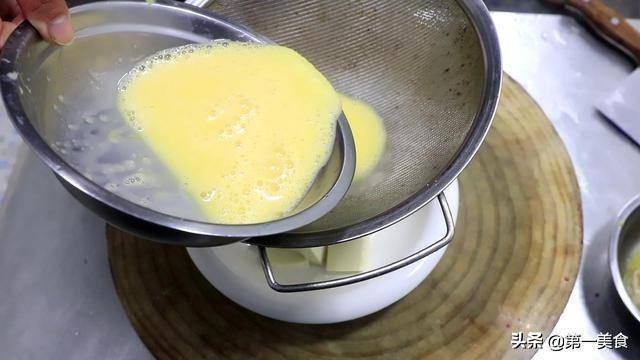 4.嫩豆腐一塊切成厚片放在盆中,拿一個漏勺把雞蛋均勻的漏在豆腐上麵,這樣可以減少氣泡的產生,並把豆腐全部掩蓋。