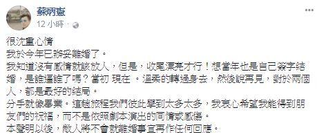▲蘇炳憲今日一早自爆離婚消息。(圖/翻攝自蘇炳憲臉書)