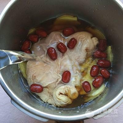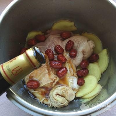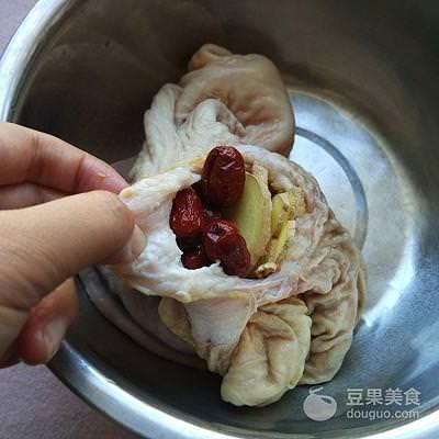 3、將清洗乾凈的豬肚放進高壓鍋裏,紅棗、生薑和花雕酒放一半進豬肚裡麵;