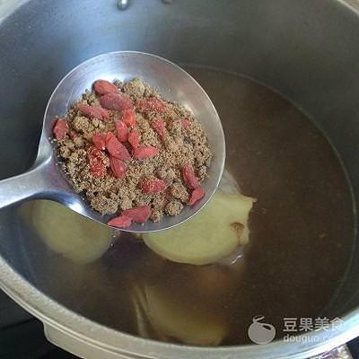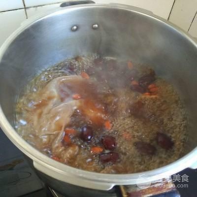 7、等高壓鍋排完氣之後,打開鍋蓋,根據個人口味,加入枸杞和適量的紅糖。重新蓋上鍋蓋,用大火再壓上20分鐘即可;