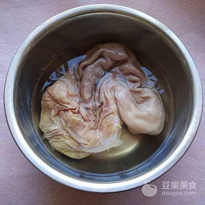 1、豬肚清洗乾凈,(清洗豬肚的小竅門:豬肚剛買回來時,豬肚表麵有很多粘液,一定要清洗乾凈,不然會有一股怪味。先用清水沖洗一遍,再用乾澱粉或者薑粉搓洗2遍,豬肚裡外兩麵都要搓洗乾凈哦!)