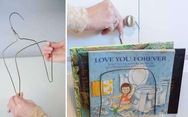細細的金屬衣架折彎,不用藉助工具,彎彎曲曲的更有藝術感,掛在把手上做鐵藝收納架,隨手放上雜誌,特有feel~