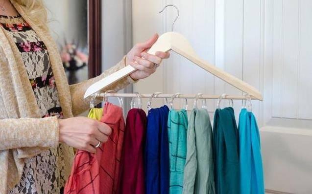利用一個掛圍巾的圓環,扣在衣架上,能掛好多條圍巾~~