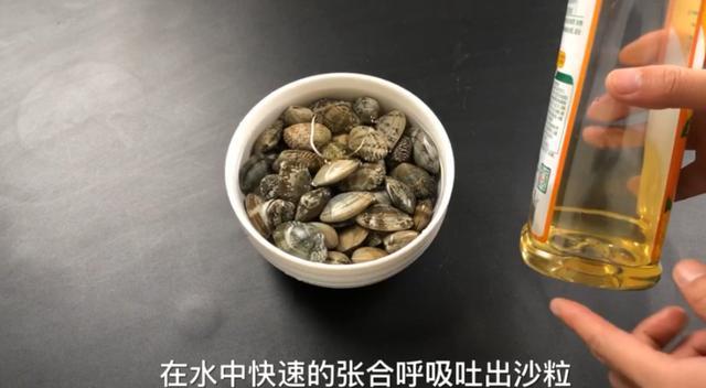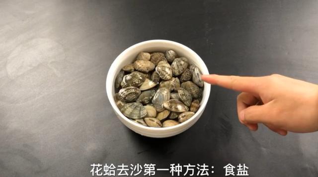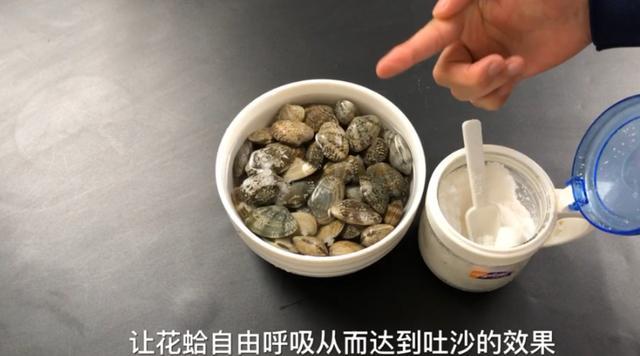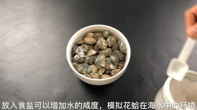 將花蛤放在碗中,倒入清水,加入一勺的食鹽,放入食鹽可以增加水的鹹度,模擬花蛤在海水中的環境,讓花蛤自由呼吸,從而達到吐沙的效果。