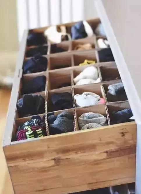 像背心、T恤這類比較薄的衣物也可以用分格抽屜進行整理,用平時包裝用的瓦楞紙做成縱橫相間的隔板更方便放置。