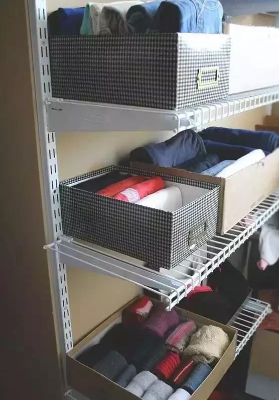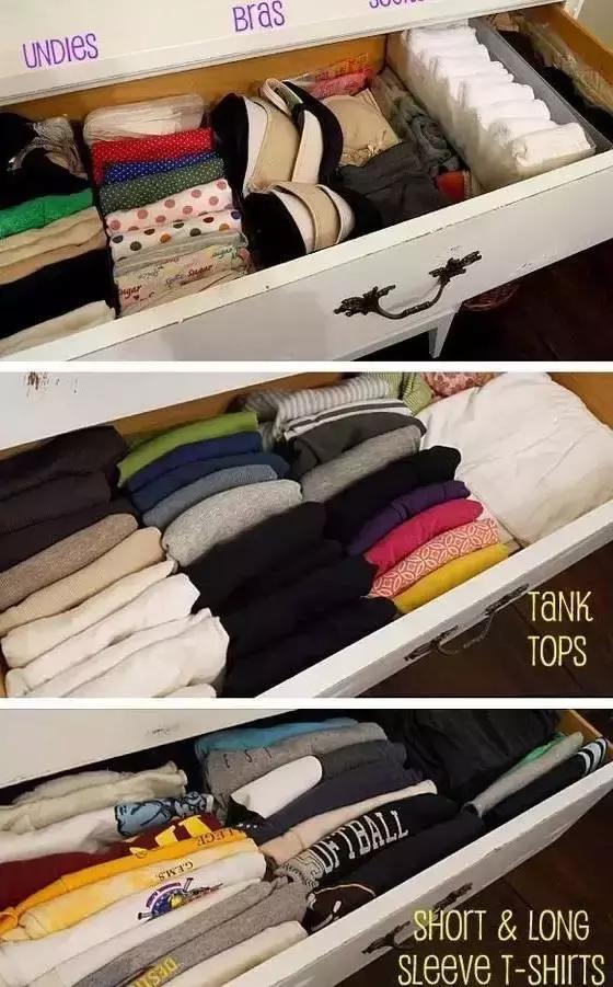 當然,如果你懶得做隔板,直接將衣物捲成條狀排列放置,這樣也比摺疊堆放來得方便。