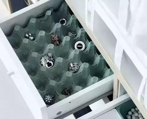首飾收納最重要的就是獨立存放,避免打結。存放在抽屜中,放一個蛋盒就能安放心愛的首飾,太機智。