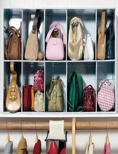 包包不能掛,容易讓肩帶變形,平放就好,使用頻率較少的放在衣櫃的最上端。