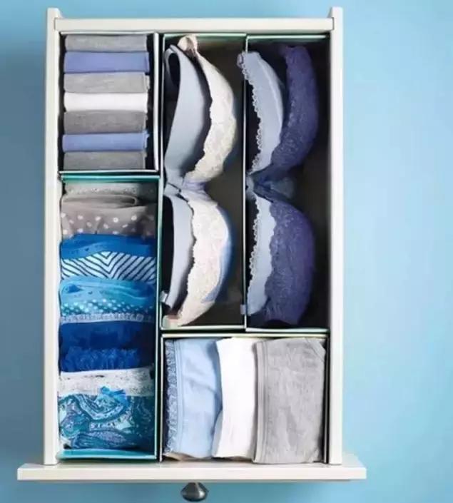 內衣褲、襪子這些小件的衣物用一個櫃子就能收納好,內衣疊放立好,既能保護內衣不變形,也節省收納空間,內褲和襪子分開存放,摺疊成塊獨立放置,更方便拿取。