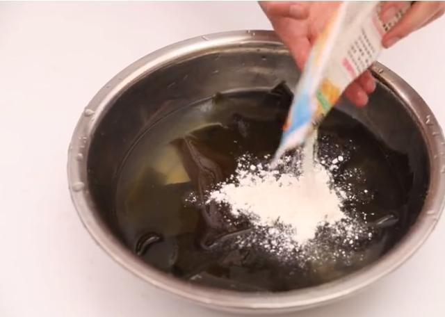 把它攪拌均勻,抓洗海帶,因為麵粉有很強的吸附功能,它能吸附掉海帶表麵的髒東西,抓洗幾下就乾凈了,給大家看一下。