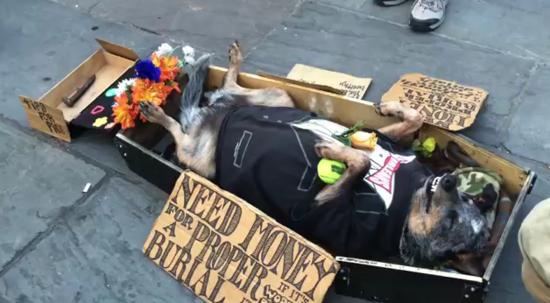 這隻”演技派”狗狗躺在一個紙殼“棺材”里,一動不動。棺材邊上的一個小紙板上寫着“我需要錢,好讓我體面地下葬”。