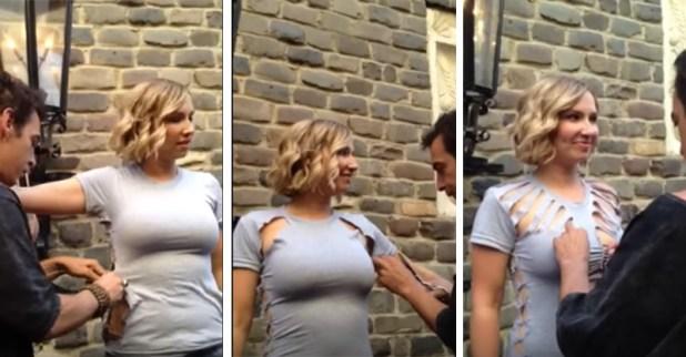 這是設計師Adam Saaks現場表演把模特兒Michelle Ashman的普通衣服剪成非常時尚有設計感的樣子,非常厲害的刀工跟設計呢!
