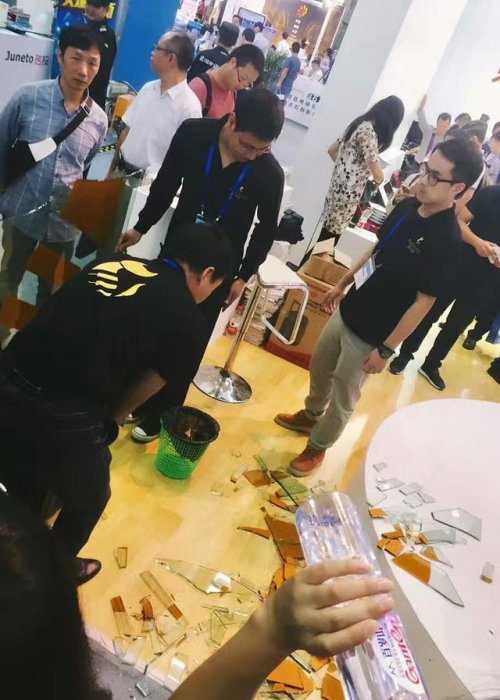 現場,玻璃四濺,吵吵鬧鬧,參觀者紛紛叫嚷“機器人鬧事啦”!!