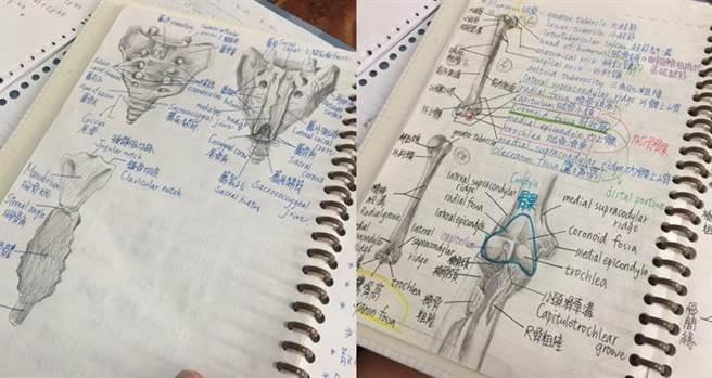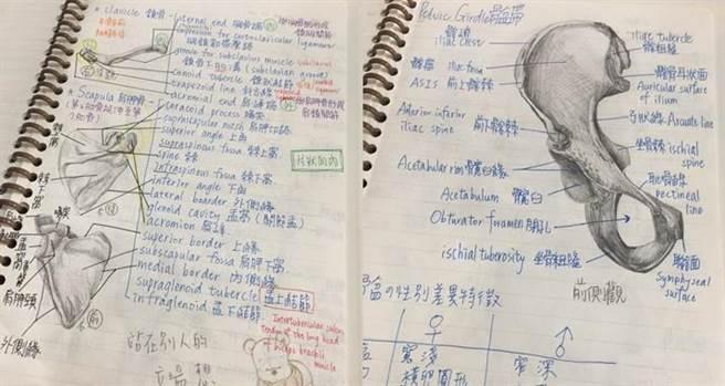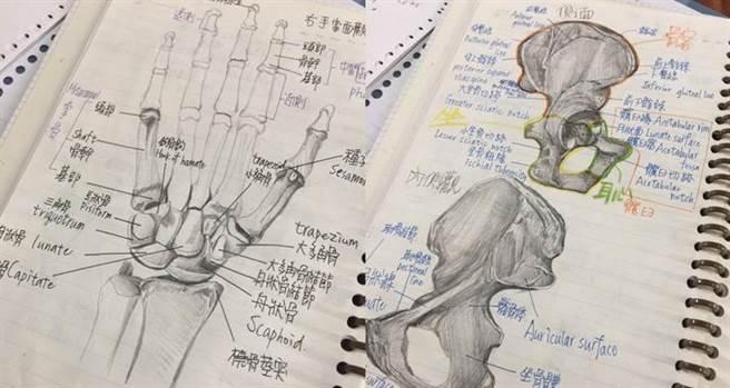 該醫學大學女大生在內文中提到:「因為科系需要考解剖,不過我說同學啊…這畫的比圖譜還猛啊!」從照片中可見到,骨頭各處被仔細的畫出來,並且用各種色筆標示,程度甚至超越課本上的圖。