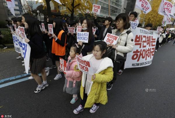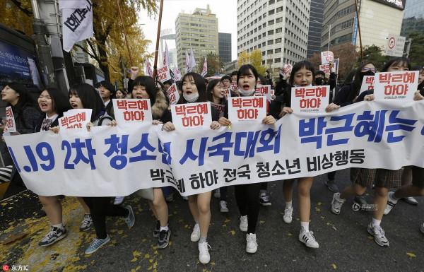很多剛剛結束高考的考生參與了當天的抗議活動,他們尤其對崔順實女兒被韓國梨花女子大學非正常錄取感到不滿。首爾考生鄭惠珠接受記者採訪時說:“考大學真的很難,而崔順實的女兒通過不正當的方式被錄取,這是嘲弄民眾的行為。”圖為韓國高中女生參加集會。