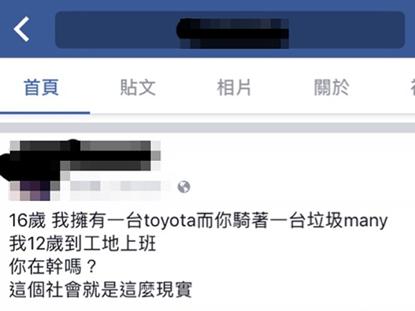 網友在PTT爆料,好奇16歲擁有一台Toyota(豐田汽車)是否很狂呢?只見臉書截圖上,一名染著紅色頭髮的少年手握方向盤,寫下嗆聲意味濃厚的字句,「16歲,我擁有一台toyota,而你騎著一台垃圾many。我12歲到工地上班,你在幹嗎?這個社會就是這麼現實。」