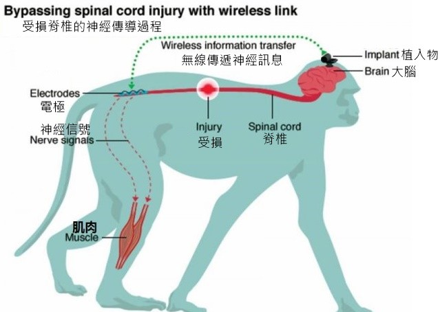 科學家在癱瘓猴子腦袋上,植入了一個無線訊號發射裝置,並在大腦與受傷的脊椎之間建立了無線配對,大腦可以完全繞過脊椎,直接透過傳遞給下半身肢體。只花了六天時間,配戴無線裝置的猴子便完全恢復了。