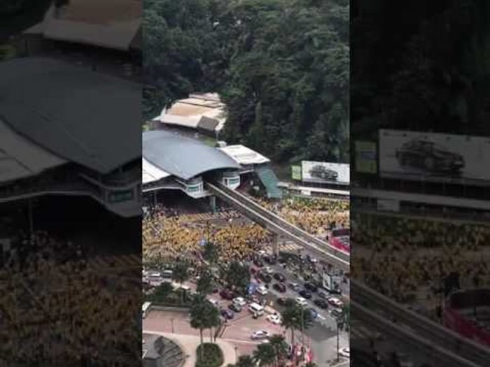 社交媒體現在正熱傳一支短片,顯示一小撮紅衣人走在馬路上,看到大批黃潮迎面而來,馬上U轉掉頭逃走。
