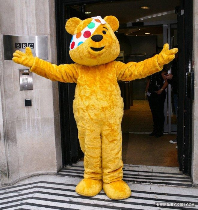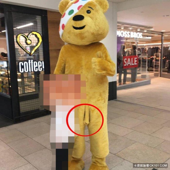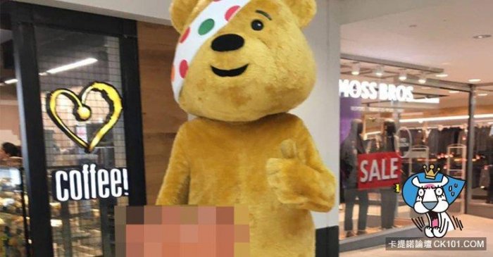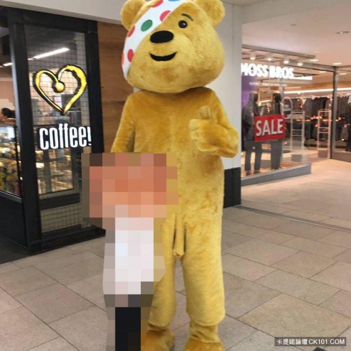 英國一名媽媽,最近帶著7歲女兒逛購物中心,遇到吉祥物Pudsey Bear,想說來合照一下。▼