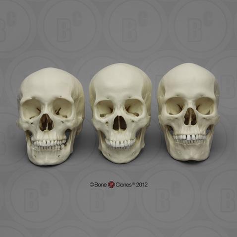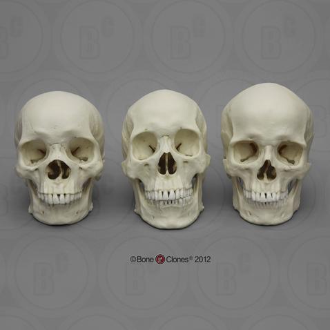 非洲,亞洲和歐洲女性頭骨(從左往右)。