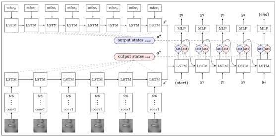 DeepMind採用的“看、聽、嘗試、拼寫”架構。首先解碼出一個特徵yi及兩個向量,再通過向量去定位對應的輸入音頻視頻流序列
