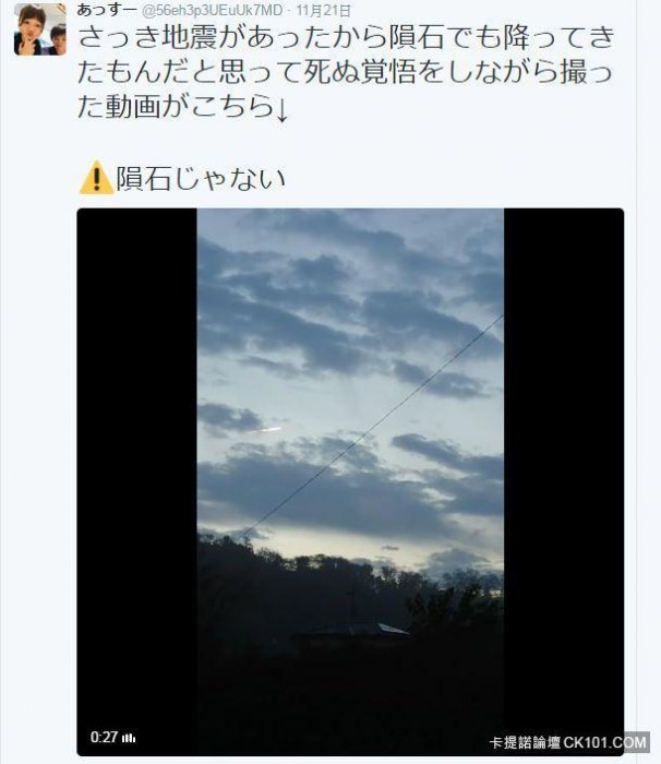 當地一名16歲化名少女「Asuka」在地震後,聲稱疑似拍下「隕石墜落」的景象。