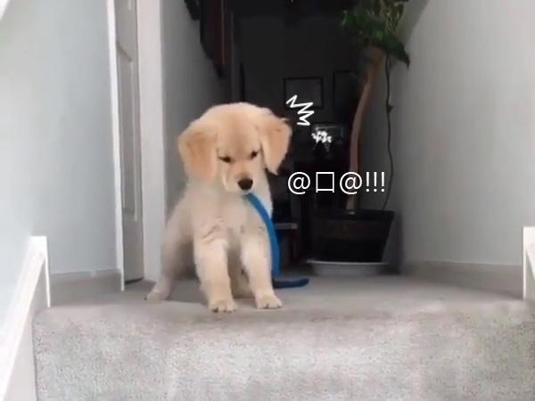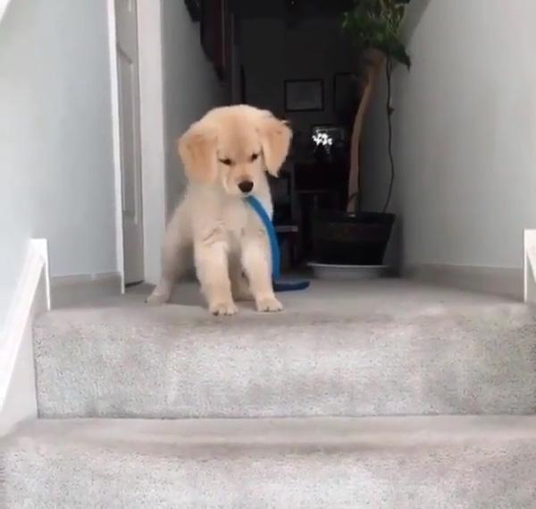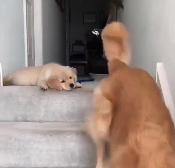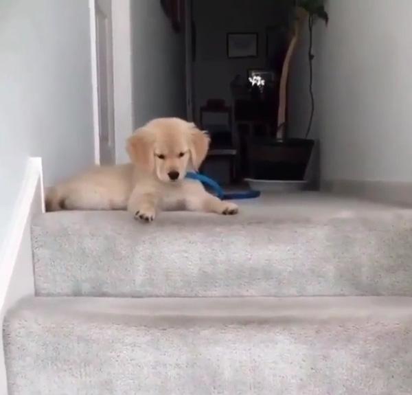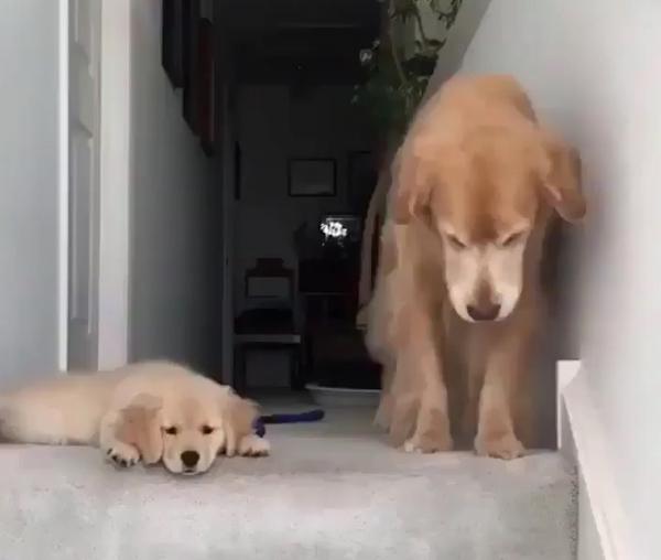所有的小狗長大的過程都要先經過樓梯的試煉,只要過了這一關就能夠順利晉級為大男孩!但在那之前就只能當給把拔馬麻抱抱的小北鼻。因此這隻小黃金獵犬看到同伴翩翩下樓時,整個驚呆了!