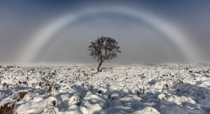 我們經常在雨後看到七色彩虹,但你見過白色長虹嗎?不久前,攝影師尼科爾森在蘇格蘭西部地區的蘭諾赫高地拍攝到了罕見的一幕。白色的長虹與雪地、孤樹相應和,形成完美的畫面,整個景色美得驚人,他忍不住感嘆:「能夠目睹這種美景簡直太神奇了」!