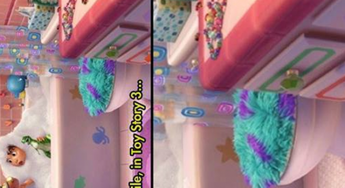 ▼沒想到在《玩具總動員3》中竟然發現一戶人家廁所的馬桶蓋上披著的正是毛怪的「毛皮」!