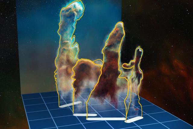 靠近一點看老鷹星雲,其中那塊明亮的區域實際上就是一個通往由塵埃所組成的暗雲中心之窗口,雲氣堆積的內部被認為是有大量恆星誕生的集中地,裡面有高大的雲柱,長度約一光年、頂部的雲氣正在蒸發,表示有新生的恆星正在發散恆星風,將物質吹散,此外還有冰冷分子氣體雲和由黯淡塵埃組成的圓形雲球,共同形成了這個年輕的疏散星團和發射星雲。