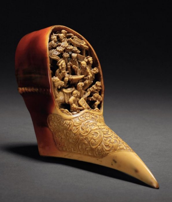 在古代中國,灰犀鳥頭骨是公侯將相彰顯身份的飾品,因其色澤外紅內黃而被稱為「鶴頂紅」,是種身分地位的象徵。