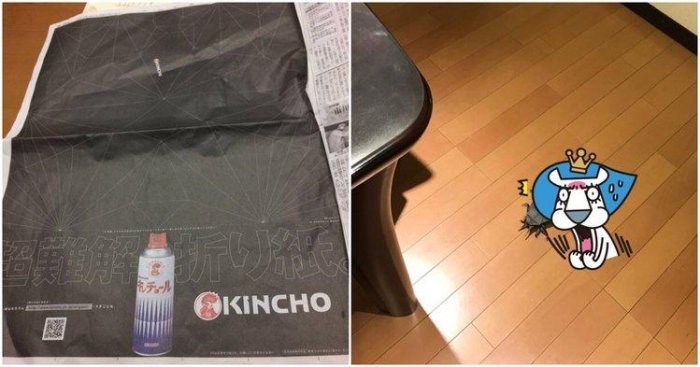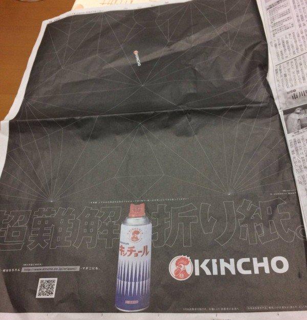 這家KLNCHO殺蟲劑,在報紙上刊登了一整面的廣告,整片黑漆漆乍看之下看不出來是什麼。仔細一看上面有許多白色折線,並告訴大家這是「超難解摺紙」。
