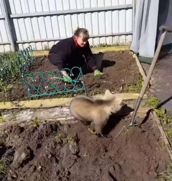 你以為幫主人拿報紙、拿拖鞋的狗狗就是世界第一聰明了?看看下面這隻俄羅斯小熊吧,牠還會幫主人耕種菜園呢。當時主人正在菜園裡忙碌,小熊就在另一邊專心挖土,還不時抬頭看看主人求表揚。