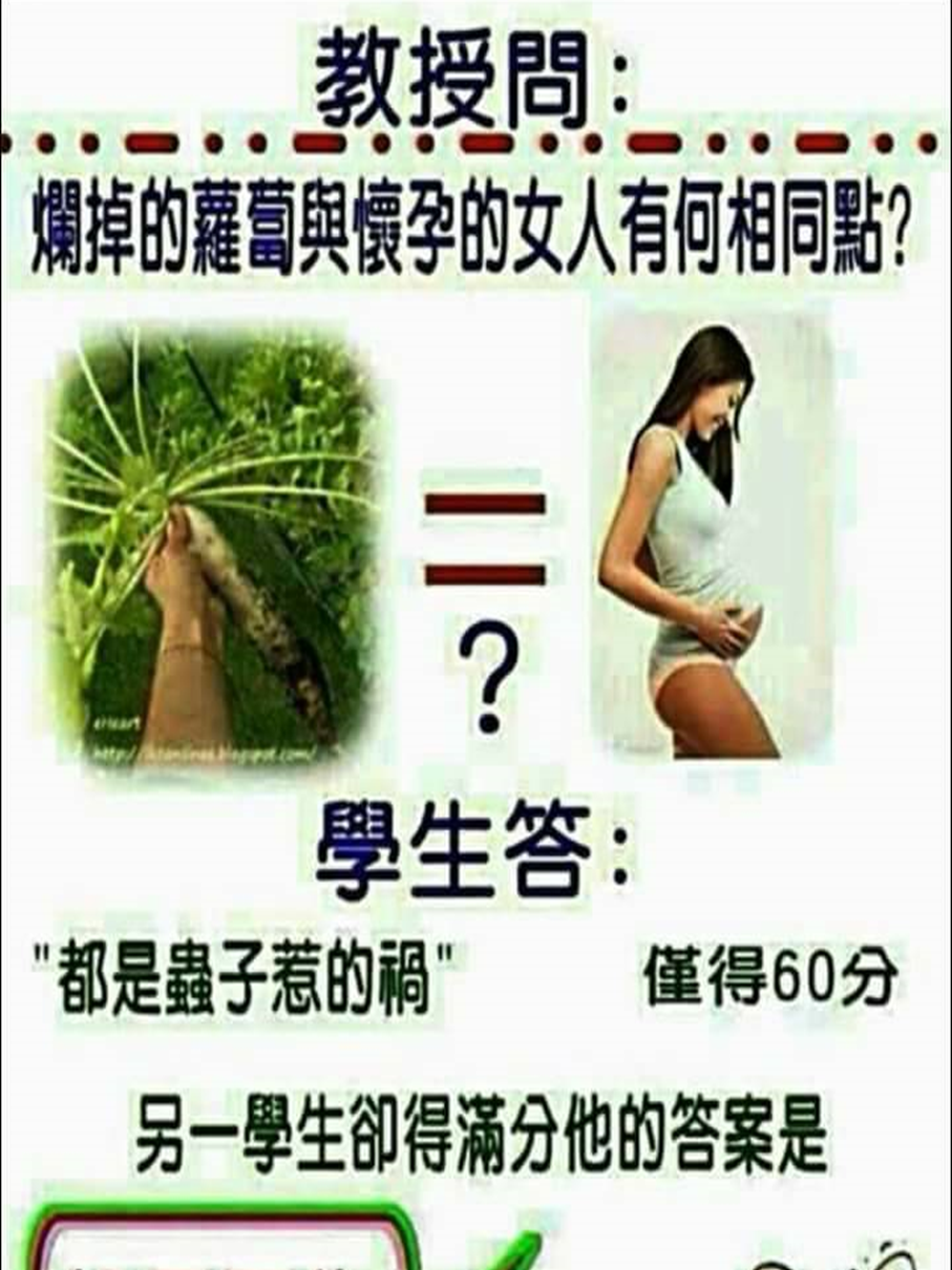 教授問:「爛掉的蘿蔔與懷孕的女人有何相同點?」 有一位學生獲得了滿分!他的答案是......