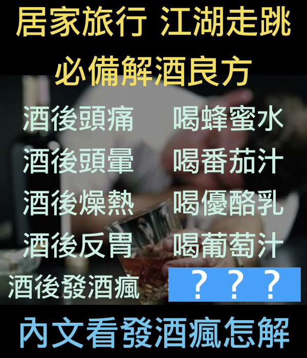 今天就來跟大家分享一下各種解酒的方法,畢竟宿醉是一件超級不舒服的事...(想死)