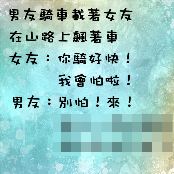 男友騎車載女友在山路上飆車,女友很害怕但男友卻這樣說