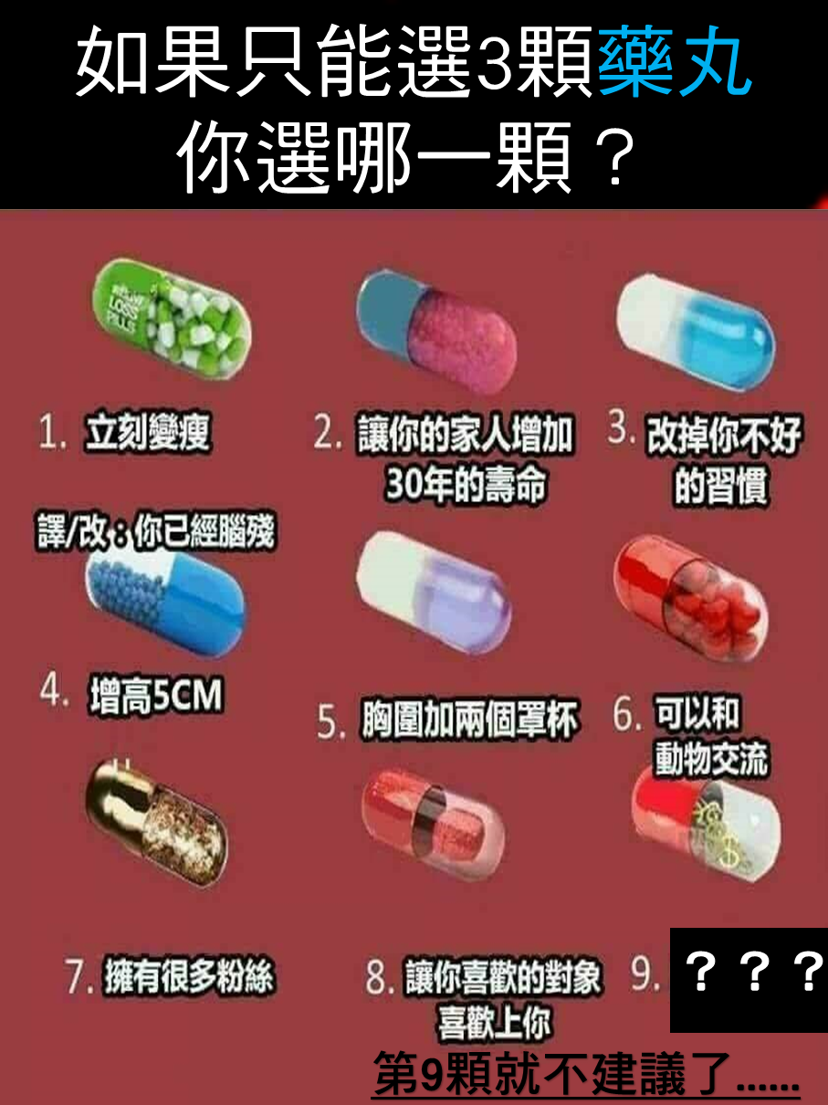 【笑爆】如果只能選3顆藥丸,你選哪一顆? 第9顆就不建議了...