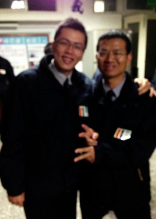 ▼苗栗通霄分局的50歲蔡金吉員警(右)今年3月9日參加白沙屯媽祖遶境活動,擔當護駕勤務,沒想到途中卻心臟病發,陷入昏迷,送醫後確認昏迷指數達3,還兩度失去生命徵象,危在旦夕!