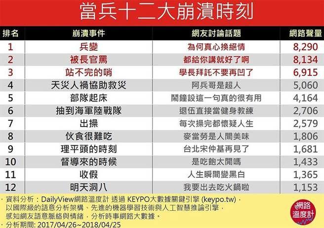 「DailyView網絡溫度計」透過網絡大數據觀察,網友們一年來在各大社群討論區、新聞的留言,統整出「當兵12大崩潰時刻」,讓後備役網友直呼實在太中肯喇!!!
