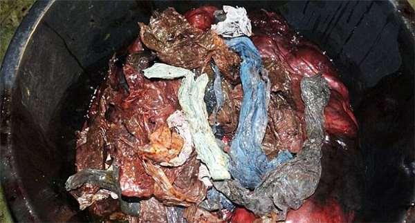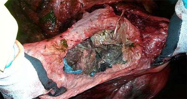 後來在當地科學家的解剖下,從鯨魚的胃中驚見塞滿的塑膠袋以及塑膠的廢棄物,因此研判這些塑膠垃圾卡在鯨魚的胃中,嚴重堵塞牠的消化道,導致牠既無法進食而虛弱地被海浪沖上岸,同時專家也研判這隻鯨魚的瘦弱,完全歸咎於生前的營養不良。