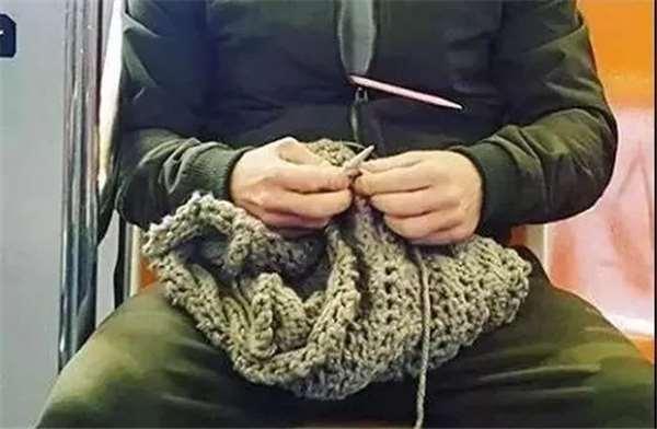別人低頭看手機,他偏偏是低頭打毛衣。