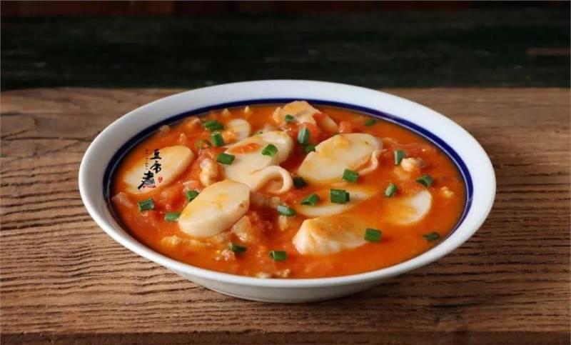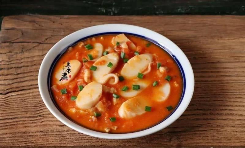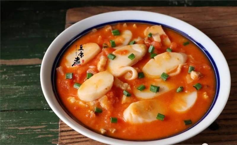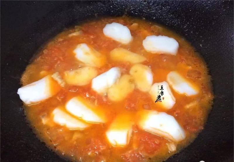 倒入三碗水慢慢燉煮至番茄爛,再放入年糕片並做調味