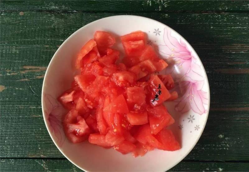 把番茄劃割個十字刀用滾水汆燙一下去除番茄的外皮,這樣食用口感會更好然後剁成碎塊