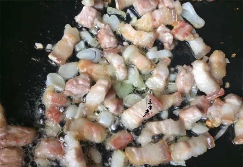 鍋熱少許油煸爆下五花肉,然後放入蔥白爆香