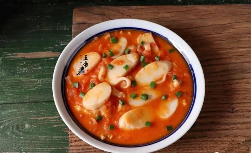材料:番茄2個、水磨年糕1條、五花肉1小塊、青蔥1根、味精1小匙、鹽適量、白鬍椒粉少許